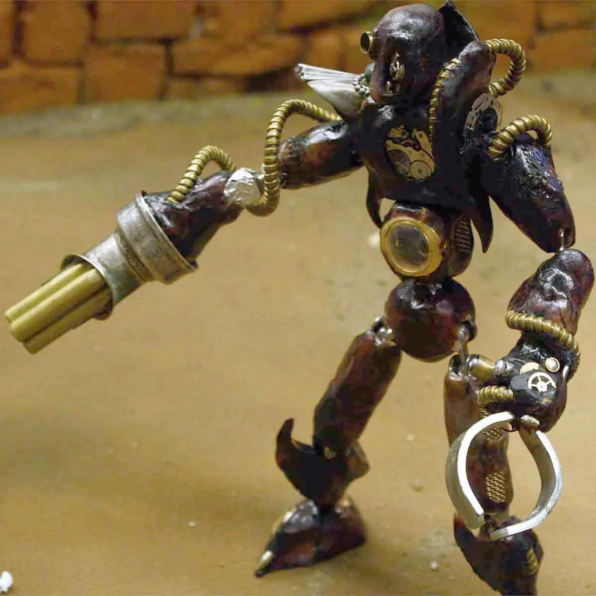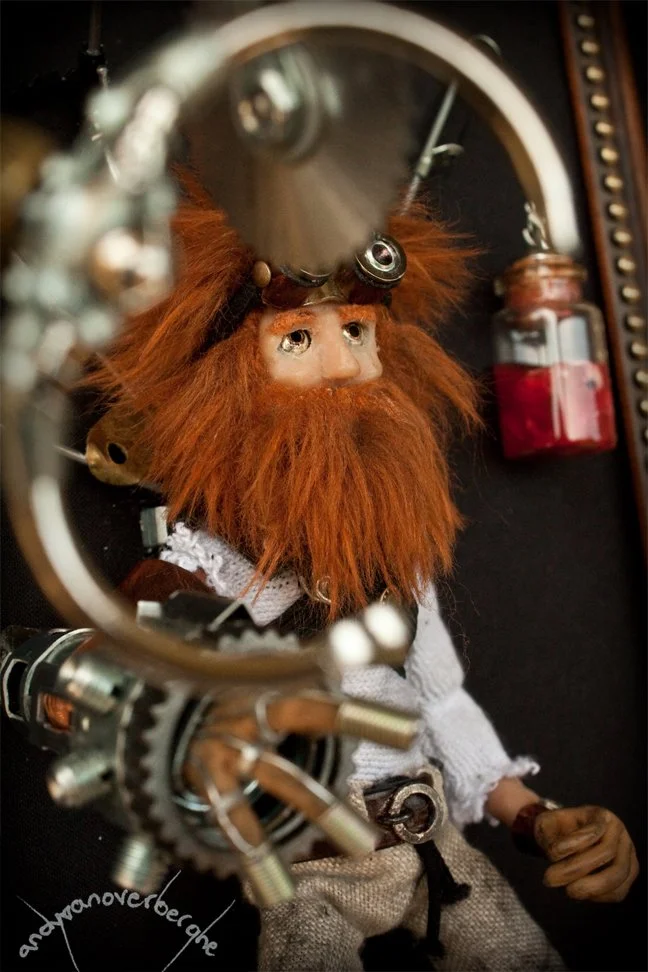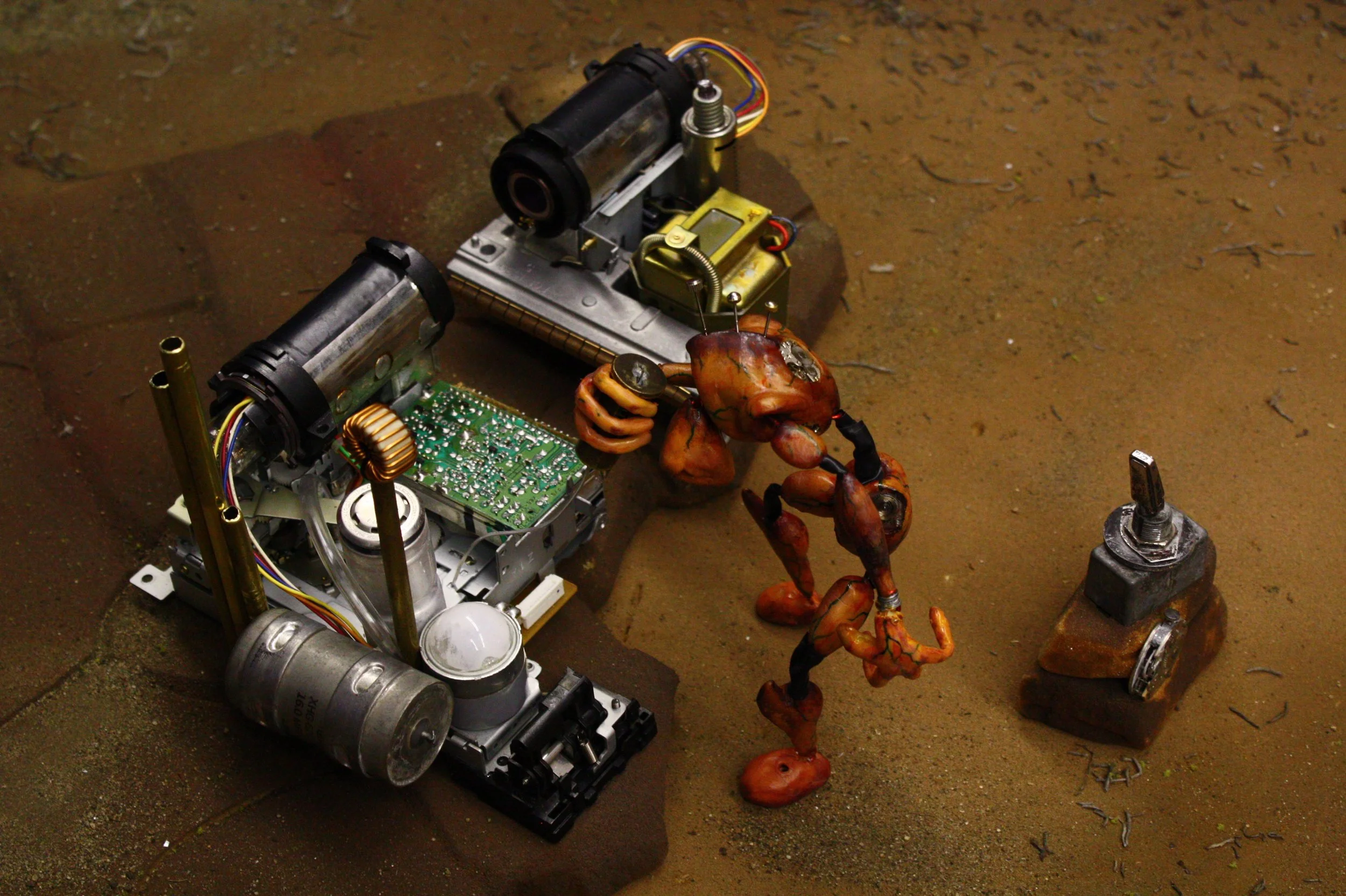 I began by painting the 2 existing puppets then moved on to design and create the remaining puppets needed including the Monster Worm, the Scout Worms, and the Executioner. I created the new characters and set props using a mixed pile of old antique clock parts, sculpey clay, and random bits of disassembled electronics. The host of the studio created 1 extra puppet in addition. With such a limited deadline there was no time for conceptualization or redesigns. It was more of a freeform build and go.
