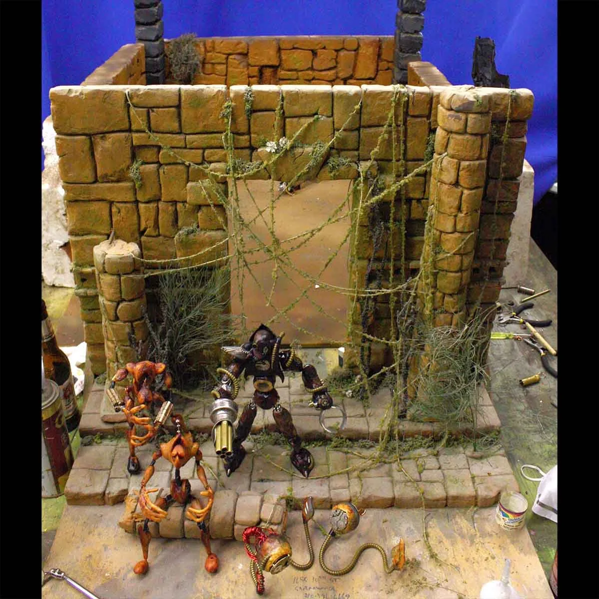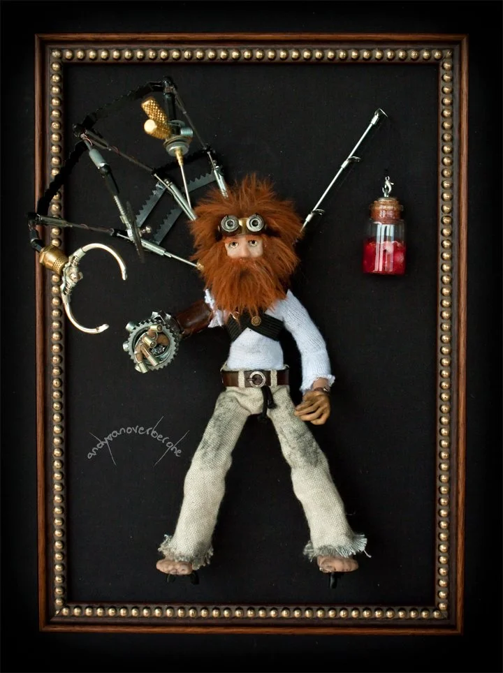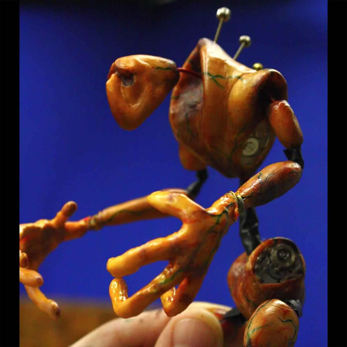 This was an experimental puppet build in 2012. Only a few test shots were done without the mechanical arms. Unfortunately lessons were learned as its skeleton quickly lost tension and it began to collapse. No movement sequences were ever completed and this puppet was retired. It can no longer hold itself upright so it stays mounted and framed on a wall.