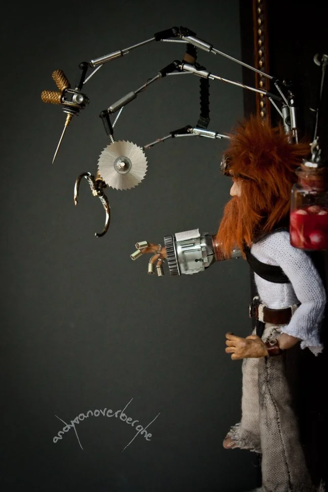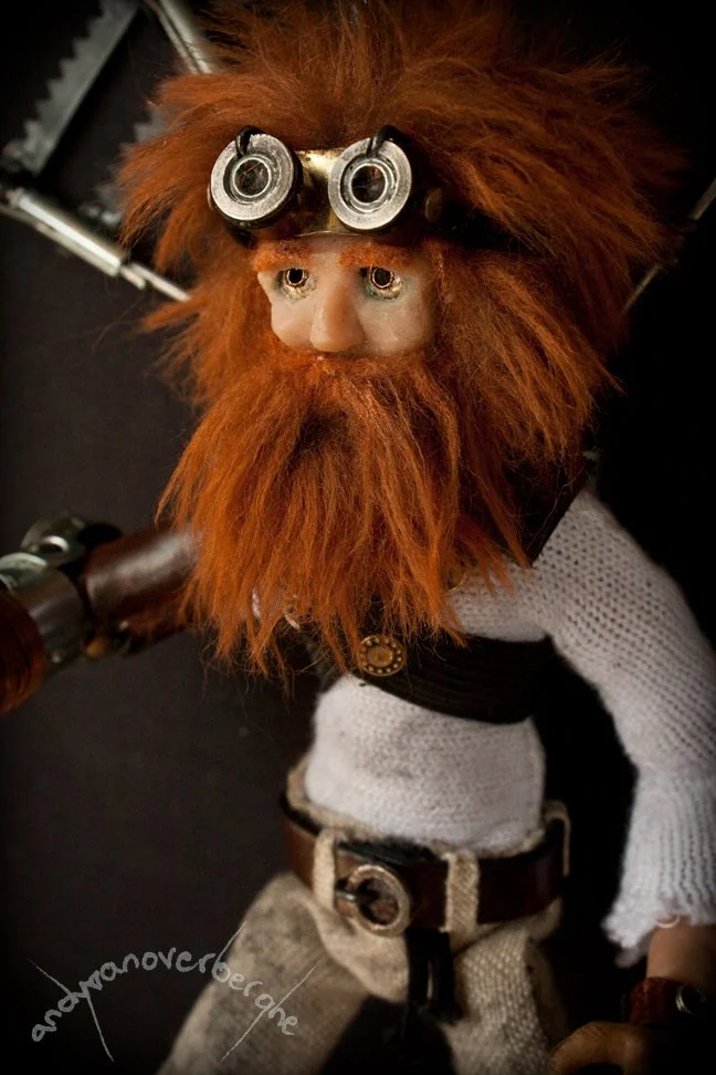 The mechanical arms were constructed and added as a way to attach the puppet to the board for display. The arms are permanently fixed to the frame but the puppet itself can be removed.
